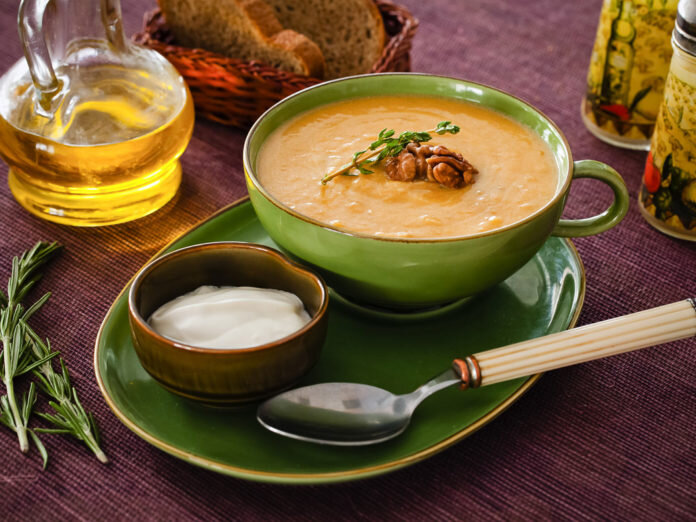 - Грецкие орехи порубить в крошку. Добавить их в суп и дать настояться 10–15 минут.