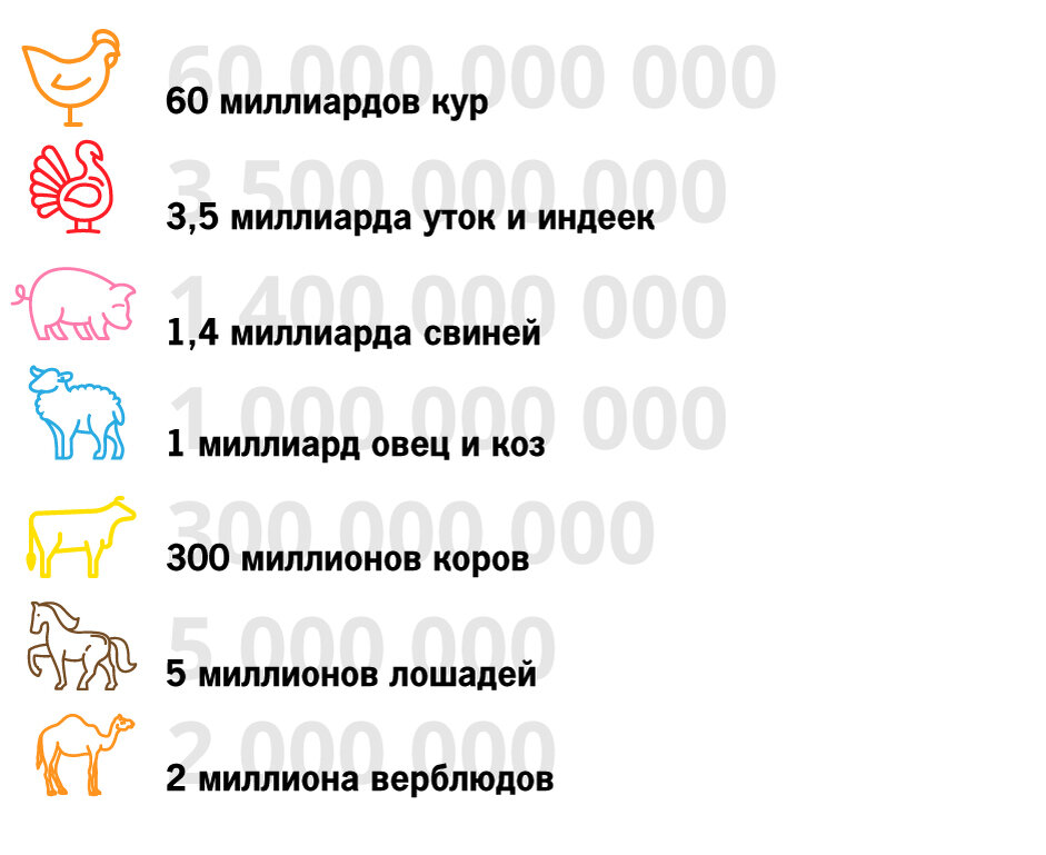 Судя по динамике в ближайшие 30−50 лет, чтобы накормить голодные рты, эту цифру нужно будет увеличивать вдвое, поскольку необходимо удовлетворять аппетиты развивающихся государств, где наблюдается демографический взрыв. Когда китайцы при Мао Цзэдуне строили светлое будущее, им в среднем в год доставалось 4 килограмма мяса на человека (примерно 11 грамм в сутки). Сегодня каждый из 1 миллиарда 379 миллионов жителей Поднебесной жарит, варит и тушит в среднем уже 55 килограммов мяса в год. А ведь есть еще и население Индии, которое по численности практически настигло китайских товарищей. И все они мечтают догнать по потреблению деликатесов Америку (янки в среднем поглощают 120 кг мяса в год) или Россию (73 кило).