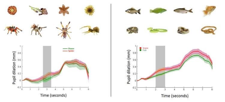 Коллектив немецких, австрийских и швецких учёных выяснил, что у младенцев возникает стрессовая реакция, когда они видят змей и пауков, даже если никогда не встречались с ними раньше. Исследователи высказали в журнале Frontiers in Psychology предположение, что боязнь змей и пауков имеет эволюционное происхождение. Когда дети видели змею или паука вместо цветка или рыбы того же размера и цвета, их зрачки значительно увеличились (красная или зелёная кривая). Это свидетельствует, что они испытывают стресс при взгляде на этих животных. Источник: Stefanie Hoehl Большинство людей в развитых странах никогда не сталкивались с ядовитым пауком или змеёй в дикой природе. Тем не менее, очень многие боятся их или испытывают к ним иррациональное отвращение. У многих людей – от 1 до 5 процентов населения – это переходит в фобию, влияющую на повседневную жизнь: человек боится входить в помещение, пока кто-то не проверит, что территория свободна от пауков, или не может выехать на природу, не боясь вс