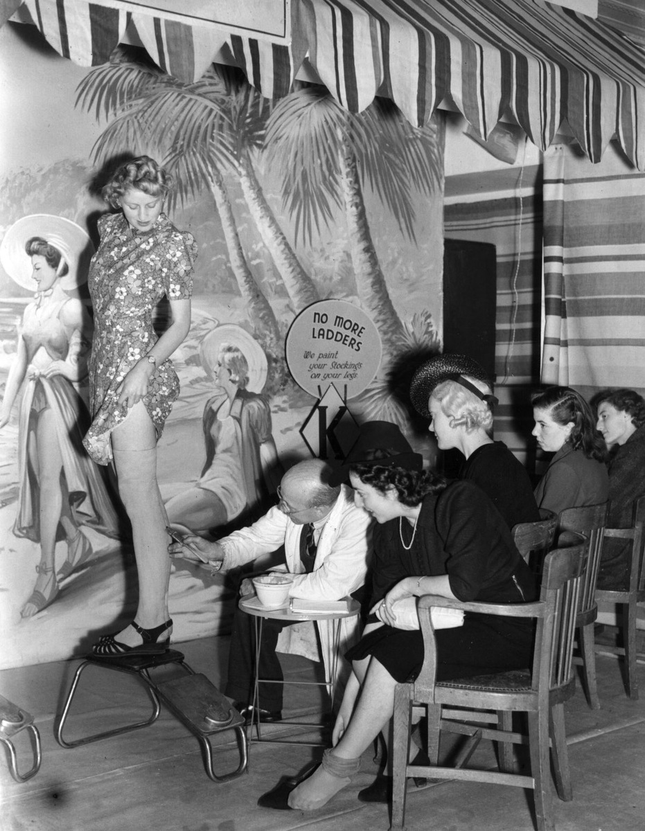 Если бы вы оказались в Америке 1940-х, то не смогли бы пройти мимо странных парикмахерских — в них женщины обрисовывали друг другу ноги. Не в качестве арт-проекта, а по необходимости. Дело в том, что в 1939 году компания DuPont подарила американкам революционную вещь — нейлоновые чулки, дешевле и прочнее шелковых и более привлекательные — а уже через два года подсевших на сексуальный будничный лук женщин постигло разочарование: страна вступила во Вторую мировую, и заводы стали выпускать вместо чулок нейлоновые парашюты, стропы и канаты. Пропаганда военного времени призывала женщину не опускать планку внешнего вида — это было бы признаком упадка духа. Да и без указок сверху прекрасная половина нации, за день покупавшая около 4 миллионов пар, не смогла и не захотела смириться с потерей. Дороги назад, к толстому неэротичному хлопку, не было, и какой-то гений сообразил симулировать наличие чулок — мол, не сам предмет гардероба вызывает восторг у мужчин, а рождающиеся в голове фантазии, с