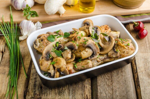 - Подавать курицу вместе с грибным соусом и зеленью.