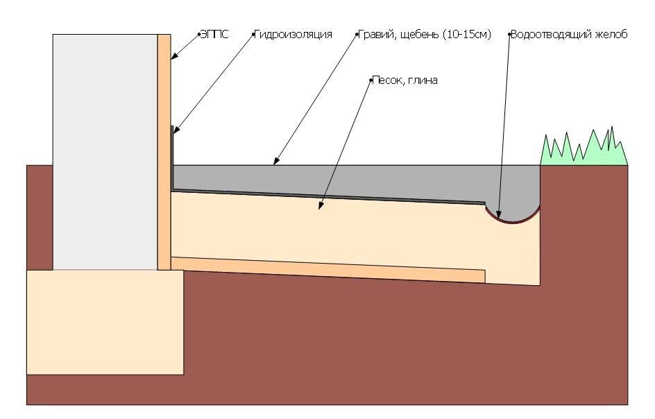 Если она строится «жесткая», например, из бетона, железобетона или асфальта, то достаточно сделать полосу из этого материала с наклоном в наружную от дома сторону. Тем самым обеспечивается сток воды от стены дома, т. к. материал не пропустит воду в грунт возле цоколя или фундамента.