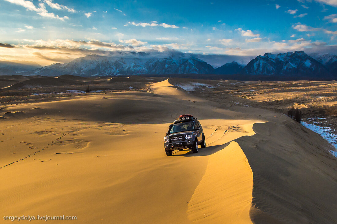 Чарские пески в Забайкальском крае — это самая северная и одна из самых маленьких пустынь в мире. От цивилизации её отделяет река и непреодолимое летом болото с огромными полчищами прожорливой мошки. Добраться сюда можно в течении пары недель осенью или весной. Сама пустыня небольшая - 10 на 5 километров. Но это одно из самых красивых и необычных мест в мире, где мне удалось побывать. По пустыне у нас было GPS ориентирование. Каждому выдали координаты точек и надо было их собрать. Скажу без ложной скромности, что наш экипаж победил с отрывом от следующего больше, чем на полчаса. Я вспомнил своё трофи-прошлое, "закусился" и мы промчались без ошибок по самому оптимальному маршруту. Получили кучу адреналина! Пустыня с высоты квадрокоптера. Снег, песок и горы с облаками: Сверху барханы похожи на складки на одеяле: На край пустыни наступает хвойный лес: Но чем ближе к центру, тем реже возникают деревья: Забраться на барханы непросто. Некоторые очень высокие и крутые: Дюны с острыми краями.