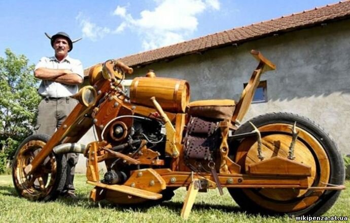 В среде суровых байкеров ценятся, прежде всего, люди с богатой фантазией, способные своими руками собрать из стандартной заводской машины настоящий чоппер, подчёркивающий индивидуальность своего владельца. Но Иштван Пушкаш, непревзойдённый венгерский мастер мотоциклетного дела, смастерил практически с нуля рабочий байк из... дерева. Умелец затратил около двух лет на создание такого чуда двухколесной техники. Чоппер практически полностью состоит из древесины белой акации, которая отличается стойкостью к любым погодным условиям. Кроме того, руль и выхлопные трубы сделаны из коровьих рогов, а заднее колесо украшено оленьими рогами. А самое удивительное то, что мотоцикл двигается, используя двигатель от малолитражки с подачей бензина из деревянного бочонка, служащего в качестве топливного бака. И несмотря на то, что байк вряд ли одолеет даже сотню километров не развалившись, автор определённо достоин уважения за свой бесценный вклад в байкерское дело и столярное мастерство.