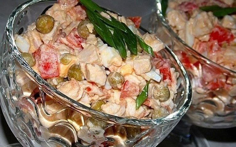 Разнообразные вкусные салатики являются обязательным блюдом любого праздничного стола. Без них не обходится ни одно застолье, поэтому накануне предстоящих праздников самое время позаботиться о том, какими салатиками вы хотите удивить и порадовать своих родных и близких. В этой статье мы предлагаем вам познакомиться с пятью простыми, но очень оригинальными и вкусными закусками. Салат с курицей, томатами и горошком Необходимые продукты: - Курица(лучше грудка) - 300 грамм (необходимо отварить) - Томаты - 3 штуки - Сваренные вкрутую яйца - 3 штуки - Горох консервированный - половина банки - Лук(зеленый) - небольшой пучок - Соль по вкусу - Сметана с майонезом для заправки Как готовить салат: Режем куриное мясо небольшими кубиками. Добавляем порезанные томаты, удалив у них семечки, порезанный лук, яйца, зеленый горошек, солим. Все перемешиваем вместе со сметаной и майонезом. Салат "Рог изобилия" Продукты, необходимы для 2-х порций блюда: - Яйцо - 1 штука - Сыр - 30 грамм - Мясо курицы