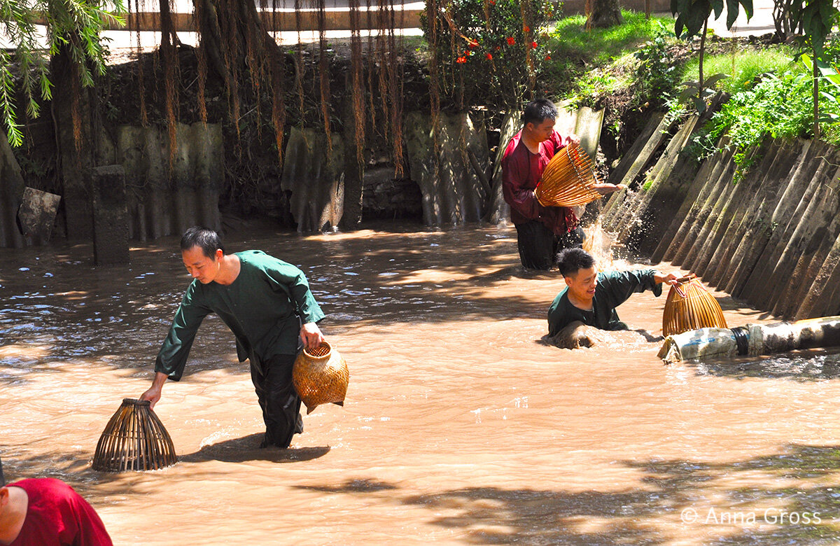 Вы ведь знаете что такое корпоративные игры? Все сотрудники собираются, преодолевают вместе препятствия, играют, в общем, по итогу развлекаются и пьют на природе. Во Вьетнаме тоже такое есть. Только игры немного другие. Вот некоторые из них. Традиционная рыбалка Собраться вместе, побултыхаться в грязной воде — вот счастье. Нет, может она и чистая, да вот только цвет буро-оранжевый от глины. Ну, так лечебные грязи никто не отменял. А тут и грязи, и не скучно. Одеваем штанишки и балахон, чтобы офисный костюм не пачкать. Берём две плетёные штукенции. Одна — сосуд для рыбы, другая — чтобы эту рыбу отлавливать в помещать в вышеупомянутый предмет, выглядит как воронка: с одной стороны раструб, с другой отверстие. На старт, внимание, марш! Время пошло! Эх, братцы, где ж тут она, не видно ж ни йy}{я, — пояснил бы наш рыбак прессе. А эти, знай смеются, да возятся в коричневой жиже. Водоём по колено. Видимость нулевая. Падают, поднимаются, гоняются за сомами. А потом пытаются их определить в д