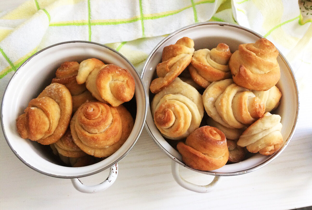 Несколько лет назад я была в гостях у своего старого друга, его бабушка собиралась печь плюшки и на это событие съехались все родственники. Все ждали тех самых плюшек. Мне тоже стало интересно, в чем их особенность. А после того как я их попробовала, сразу всё стало ясно - они очень вкусные, мягкие, нежные и их очень-очень много! Я тогда спросила рецепт, записала на бумажку и она пропала в просторах моей сумки. Но недавно я ее нашла и решила приготовить их тоже. Получилось точно так же, как я пробовала. Теперь мои родственники ждут моих плюшек! У меня получилось так (на фото только часть, плюшек вышло раза в два больше): Ингредиенты на много-много плюшек (захотите меньше - делите напополам): Взбиваем миксером молоко с сахаром, добавляем растительное масло, дрожжи и всыпаем порционно муку. Тесто должно чуть-чуть прилипать к рукам. Накрываем кастрюлю полотенцем и ждем 1,5-2 часа пока тесто поднимется. Учитывайте, что тесто поднимется сильно, поэтому кастрюля нужна большая, особенно, есл