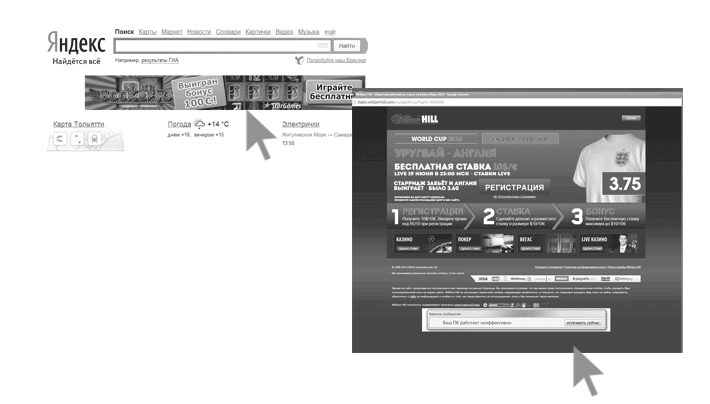 Подобного рода всплывающая реклама появляется в браузере Яндекс, Google Chrome, у некоторых — в Опере. Признаки одни и те же: при клике в любом месте любого сайта появляется всплывающее окно с рекламой, а на тех сайтах, где вы и раньше могли видеть рекламные баннеры, они подменяются на рекламу с предложениями разбогатеть и другим сомнительным содержанием. Еще один вариант поведения — самопроизвольное открытие новых окон браузера, даже когда вы не запускали его.
