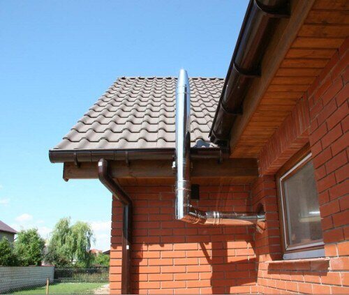 Если вы не хотите дырявить кровлю или просто нет необходимости выводить вентиляцию через нее, можно пустить трубу через отверстие в стене.