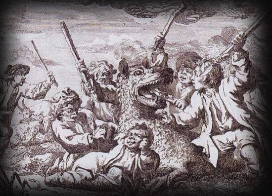 Если верить легенде французский Жеводанский зверь успел за свою жизнь убить примерно 60-100 человек. Это всего за три года - с 1764 по 1767 год. Очевидцы сообщали, что этот дикий зверь, размером с взрослую корову, обладал длинным хвостом, который был похож на хвост льва. Он обладал красной шерстью, а на голове его красовались маленькие остроконечные ушки, конечно же, зверюга был обладателем острых клыков. В свое время еще великий король Людовик XV послал своих лучших охотников, чтобы они убили этого дикого зверя. В 65 году охотниками был убит невероятно большой волк, но убийства мирного населения не прекратились. Спустя два года им таки удалось убить что-то, похожее на Жеводанского зверя. Когда ему вспороли живот, то обнаружили внутри останки маленькой девочки. После этого убийства остановились, но вот ученые до сих пор не знают, что же это могло быть за создание.