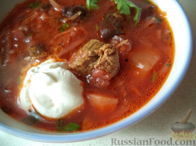 Каждая хозяйка уверена, что уж она-то знает, как правильно варить борщ! Но, может быть, вам интересно будет узнать, каков рецепт борща классический по мнению некоторых кулинарных книг. Итак, варим борщ - рецепт классический. Продукты (на 8 порций) Вода - 2 л Говядина - 500 г Картофель - 500 г Капуста - 500 г Свекла - 300 г Морковь - 300 г Лук репчатый - 2 шт. Томат-паста - 2 ст. ложки Масло растительное - 2 ст. ложки Чернослив - 5 шт. Зелень петрушки - 1 пучок Сметана - 8 ст. ложек (по вкусу) Соль - 0,5-1 ст. ложка (по вкусу) Если чернослив сухой, рекомендуем подержать его в кипятке 10-15 минут. Готовый борщ разливают по тарелкам, посыпают измельченной зеленью петрушки.