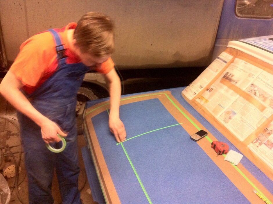 Процесс покраски очень трудоемкий, очень много времени ушло на маскировку. Были сделаны специальные трафареты, шаблоны. На покраску крыши ушло несколько дней. В первый день был нанесен базовый цвет- белый, на него нанесены блёстки и лак. Затем после высыхания, крыша шлифовалась и на неё наносился узор, постепенно от центра к краям, начиная с тюли, заканчивая полосами. Далее наносился лак, сушка, шлифовка и опять лак.