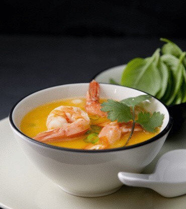 3. Очистите креветки. Китайскую капусту мелко порежьте. Положите в бульон и дайте разогреться. Добавьте сок половинки лайма и порезанные листья кориандра. Размешайте.