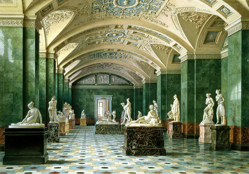 Вот так выглядел этот зал на акварели Премацци. В те времена зал назывался: »Первый зал новейшей скульптуры». В отделке зала, как и всех помещений первого этажа Нового Эрмитажа, широко использованы мотивы античной архитектуры. Зал напоминает роскошную базилику, обширное пространство которой наполняют статуи и бюсты.