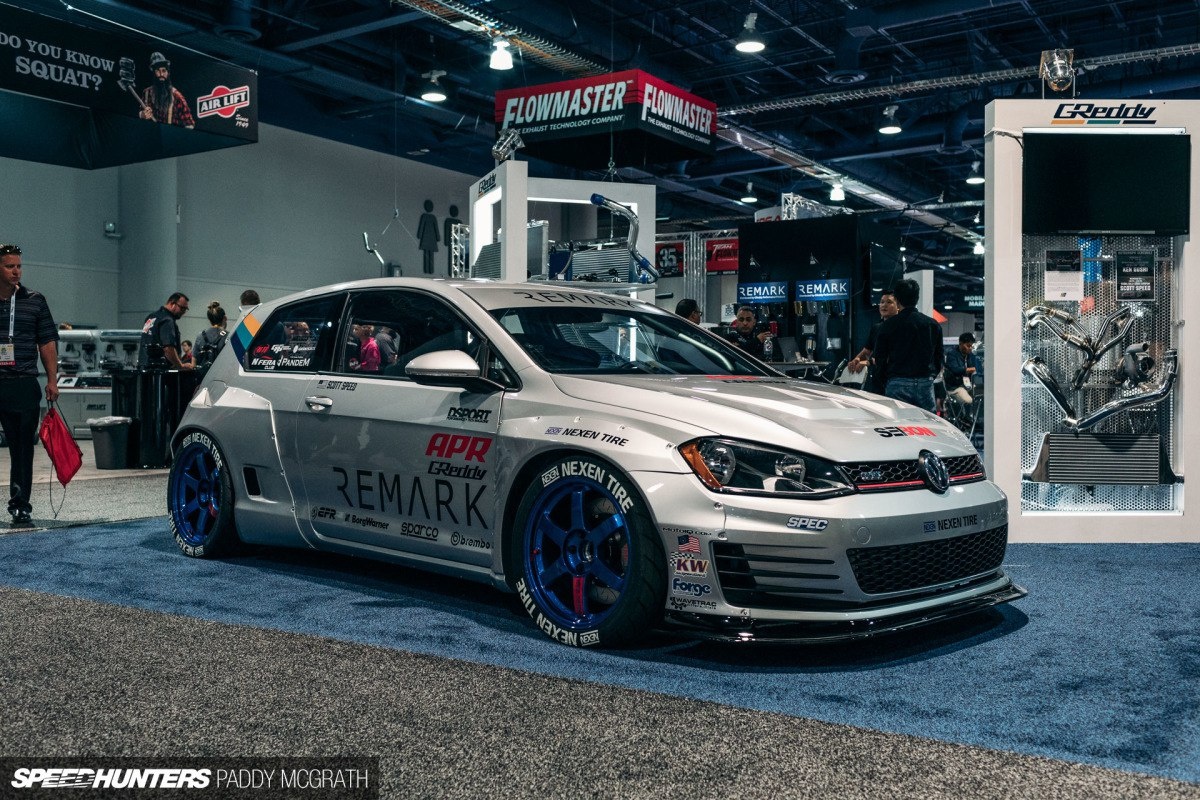 Ещё один интересный автомобиль с SEMA, услада очей для любителей VAG'а, один из любимых автомобилей Джереми Кларксона, давший название целому классу. Golf GTI Mk7 550 л.с. И снова люди демонстрируют отсутствие предвзятости к мощному переднеприводному спортивному автомобилю. В данном состоянии он почти во всеоружии – кузов усилен каркасом, механизмы Brembo готовы остановить планету, двухлитровый TSI на BorgWarner'е и магии APR будет послушно выдавать все 550 единорогов. Расширение Pandem чаще используется для повседневных машин и шоу-стопперов, но, как видите, может быть вполне уместным и в чистом спорте. Перед выездом на трек этот гольф получит более широкую резину и некоторые аэродинамические улучшения, а пока он выгодно выделяется на фоне однообразной в целом выставки.