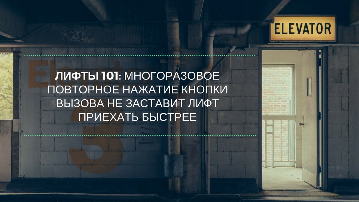 1) По статистике, после 45 секунд ожидания лифта, люди начинают испытывать раздражение и им кажется, будто они ждут лифт уже вечность, поэтому они начинают повторно нажимать на кнопку вызова по несколько раз, надеясь, что лифт в этом случае быстрее приедет. Но нет. Лифт в этом случае не приедет быстрее.