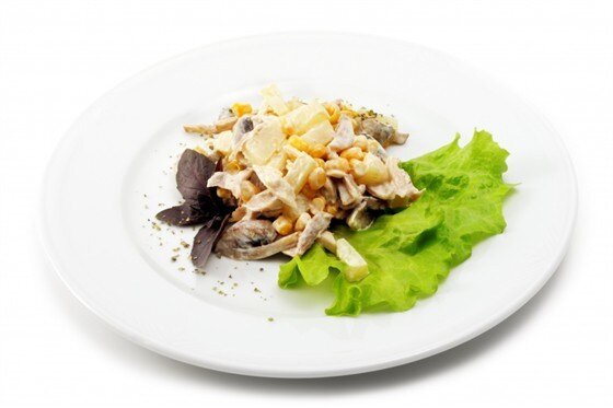 Ананасы лучше взять консервированные не кольцами, а кусочками: не придется их резать. Ингредиенты Яйцо куриное 2 штуки Майонез по вкусу Консервированная кукуруза 1 банка Консервированный ананас 380 г Огурцы 2 штуки Куриное филе 300 г Инструкция приготовления 1. Куриное филе отварить и разделить на волокна или нарезать мелкими кубиками. Огурец порезать соломкой, яйца сварить вкрутую и мелко порубить. 2. Салатник лучше взять прямоугольной формы, чтобы слои получились равными. Выложить ингредиенты слоями, промазывая майонезом, в такой последовательности: курица, ананасы, огурцы. Отставить на 15–20 минут, потом сверху выложить слои яйца и кукурузы. Еще больше рецептов на сайте eda.ru Подписывайтесь на наш инстаграм @edaruofficial — каждый день вкусные рецепты!