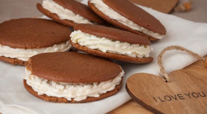 - С помощью кондитерского шприца или мешка нанести крем на одну половинку печенья, сверху накрыть второй половиной печения.