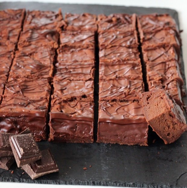Выложить тесто в форму для выпечки, застеленную пергаментной бумагой, и выпекать в предварительно разогретой до 150 градусов духовке 20-25 минут (в зависимости от размера формы). - Дать торту немного остыть, а затем убрать в холодильник на 2 часа. Приготовить глазурь. В одной миске растопить 25 граммов масла в оставшимся горьким шоколадом, а в другой – 25 граммов масла с молочным шоколадом. Смазать торт смесью с молочным шоколадом, а края – с черным. Убрать в холодильник на 30 минут, чтобы шоколад застыл.