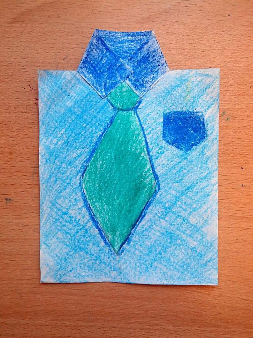 Способ создания: Лист бумаги свернуть пополам, а затем ещё раз пополам. Разрезать так, чтобы у Вас на руках остался лишь один прямоугольник из бумаги. Если открытку делать из картона, то можно просто врезать прямоугольник нужного размера. Затем, нужно сделать небольшие, примерно до середины листка, продольные разрезы сверху прямоугольника и согнуть их к середине. Это будет "воротник рубашки". Далее, из отдельного листа бумаги/картона нужно врезать галстук и приклеить под воротник. Галстук можно сделать как из белой бумаги/картона, так и из цветного материала. Ну, и в конце нужно раскрасить открытку и возможно украсить её интересными узорами. И не забудьте на обратной стороне написать прият