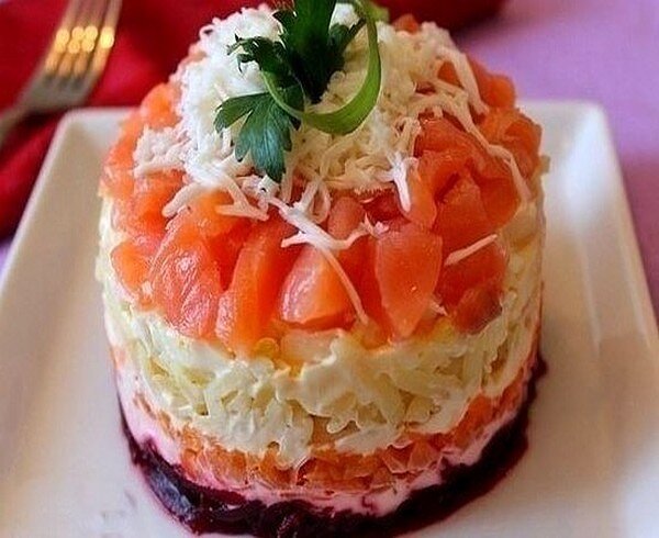 ИНГРЕДИЕНТЫ: ● 200 граммов креветок (уже почищенных); ● 150 граммов слабосоленой семги или форели; ● 3 яйца, сваренных вкрутую; ● 100 граммов сыра; ● ½ банки маслин без косточек; ● 1 спелый крупный помидор; ● кунжутное семя для украшения ПРИГОТОВЛЕНИЕ: Заправка для этого салата готовится из смеси сметаны с майонезом (1:1) с добавлением лимонного сока по вкусу. Сваренные вкрутую и почищенные яйца и сыр нужно натереть на крупной терке. Маслины нарезать тонкими кружочками, креветки кубиками. Соединить все в миске и добавить салатную заправку, перемешать. Переложить получившуюся массу на плоское блюдо, придать салату форму звезды. Теперь приступаем к украшению поверхности. Для этого тонко-тонко нарежем помидор и красную рыбку пластинками. Выкладываем на звезду сначала ломтики помидора, затем пластиночки рыбы. Сверху посыпать кунжутным семенем. Можно сервировать салат Звезда кусочками лимона, маслинами и креветками. Готово!