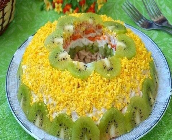 Ингредиенты: ● куриное филе - 1 шт. ● яйца куриные - 4 шт. ● киви - 4 шт. ● яблоко зелёное - 1 шт. ● морковь - 1 шт. ● чеснок - 1 зубчик ● лимонный сок - 1 ст. л. ● майонез - по вкусу. Приготовление: Следует сразу сварить куриное филе, морковь и яйца. Куриное филе нарезать кубиками. Также нарезать 2 киви, а 2 киви оставить для украшения. На плоскую тарелку в центр поставить стакан и выложить вокруг куриное филе. Сверху выложить кубики киви. В майонез выдавить чеснок и нанести его сверху киви. Майонез следует немного разравнивать с помощью вилки, чтобы он ложился более ровным слоем. Яйца разделить на белки и желтки и натереть по отдельности. Слой белков выложить поверх киви и снова нанести майонез.Морковь натереть на тёрке и выложить сверху белков. Снова нанести майонез.Нарезать кубиками яблоко, очистив его от шкурки, сбрызнуть лимонным соком. Яблоки выложить поверх морковного слоя и тоже смазать майонезом. Посыпать салат натёртыми желтками и украсить ломтиками киви. Ак