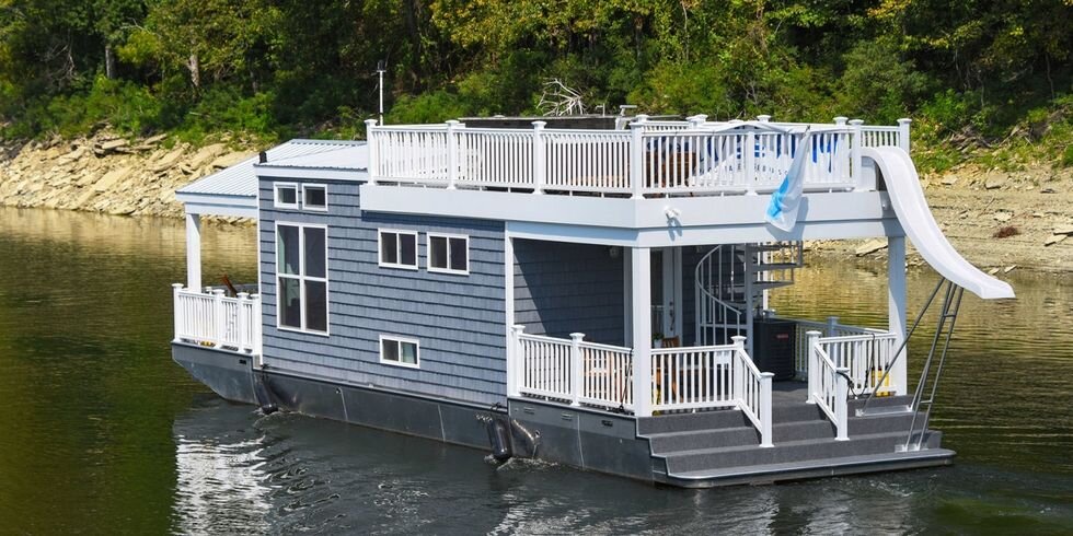 Палуба выглядит невероятно!Думаю все из нас хотели бы себе такой домик на воде.Для тех из нас, кто мечтает жить у воды, этот крошечный дом, оправдывает все ожидания.Этот домик содержит множество удобст, инновационных технологий. Открытая кухня оснащена островом и необходимыми бытовыми удобствами, такими как плита верхнего уровня, микроволновая печь, холодильник с двойной дверью, полноразмерная посудомоечная машина, стиральная машина и сушилка, можно сказать сделано всё для повара.Кроме того, столешницы и шкафы могут быть настроены в соответствии с вашими личными пожеланиями. В спальную комнату установлена кровать "королевских размеров".В нижней каюте позаботились и о гостях имеется кровать почти такого же размера.Ванная действительно заставляет владельцев чувствовать, что они живут по королевски в небольшом пространстве с ванной и полной к ней комплектацией. Этот домик-лодка имеет достаточно места для всех ваших летних развлечений.Крыша так же имеет бассей и горку прямо в реку.