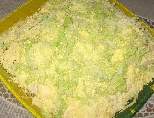 Иногда хочется приготовить что-то вкусное, лёгкое и необычное, мы рекомендуем обратить внимание на наш салат, рецепт его очень простой, а вкус восхитительный. Салат получается лёгкий и пушистый, готовится слоями. Если вы ждёте гостей и нужно быстро что-то приготовить, тогда это блюдо придет вам на помощь. Ингредиенты 1 грудка курицы (300 гр.) 2 картофелины 4 яйца 1 луковица 150 гр. твердого сыра 300 гр. пекинской капусты Майонез Соль и черный молотый перец по вкусу Приготовление На дно салатника поливаем тонкой сеточкой майонез, и посыпаем натертым прямо над салатницей отварным и очищенным в мундире картофелем, который потрем на крупной терке. Затем посыпаем нарезанным полукольцами луком, который на минуту залили кипятком, для удаления излишней горечи. Посыплем солью и черным молотым перцем и снова сделаем сеточку из майонеза. Далее слой отварной и порезанной на мелкие кусочки куриной грудки. Затем натертый белок и натертый сыр, а за ним снова сетка из майонеза. Дальше посыпаем н