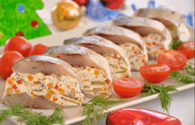- Одну половинку филе сельди выложить на пищевую пленку, сверху ровным слоем разместить начинку. Накрыть второй половинкой филе, обернуть пленкой и убрать в холодильник. Перед подачей нарезать.