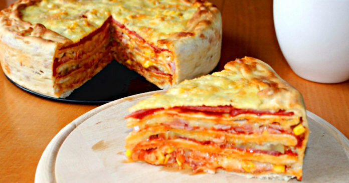 - Выложить на дно формы первый корж, смазать его соусом, поперчить, посыпать сушеным базиликом. Сверху выложить часть начинки, как при приготовлении обычной пиццы. Накрыть вторым коржом и продолжить формировать изделие, пока не закончатся составляющие. Краями бортика подвернуть к начинке на верхнем корже.