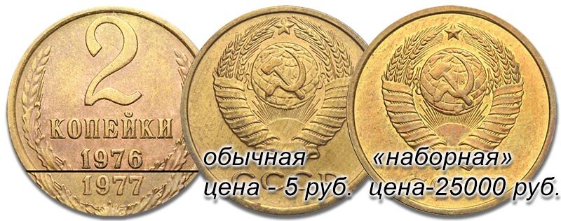 Нумизматам известно два варианта 2-копеечной монеты с датой 1976 и если одна разновидность выпущена тиражом в сотни миллионов экземпляров и коллекционной ценности не представляет (цена максимум 5 рублей), то второй оценивается нумизматическими каталогами в 25.000 рублей. Чтобы разобраться в этих разновидностях, и не пропустить эти редкие и такие дорогие 2 копейки 1976 года, надо обратить внимание на то, как выполнены некоторые элементы герба СССР. У более позднего варианта (шт. 3.1) они выполнены, с множеством тонких элементов, такое стало возможным только после значительного усовершенствования технологии монетной чеканки. Сам герб стал несколько отстоять от верхнего канта монеты, изменилась форма звезды в его верхней части, изображение колосьев стало более реалистичным, тонко проработанным. Но самое заметное отличие можно увидеть, если посмотреть на зерна во внутренних колосьях. На монетах, выполненных «обычным» вариантом штемпеля (шт.2.6), зерна имеют упрощенную, овальную форму