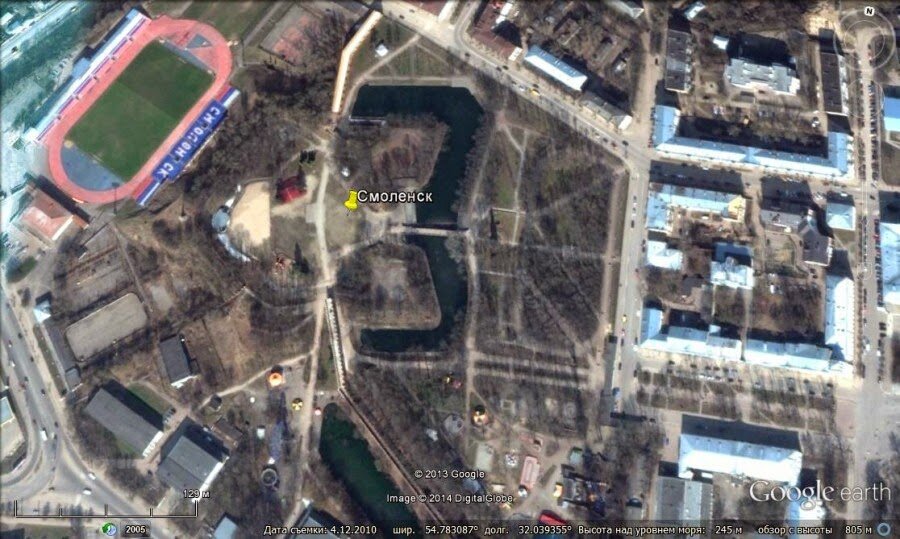 Примечательно что крепость-звезду пересекает Смоленская крепостная стена, возведенная (согласно официальной истории) при царях Федоре Иоанновиче и Борисе Годунове в 1595-1602гг. на месте более древней крепости, построенной (как считается) при великом князе Ростиславе Мстиславовиче в 1142г.. Является ли крепость-звезда в Смоленске крепостью великого князя или нет – вопрос. Но факт, что крепостная стена Бориса Годунова стоит НА крепости-звезде, пересекая ее с севера на юг и разделяя на две части – два восточных луча звезды оказываются внутри стены Годунова, а три западных – вне ее. Вывод – крепость звезда построена РАНЕЕ крепости Бориса Годунова, т.е. задолго до 1595г., возможно это и есть крепость великого князя Ростислава Мстиславовича от 1142г. Если так – то такие крепости по миру пошли с территории Древней Руси, а никак не с Западной Европы, как принято считать сейчас. Возможно что именно русами и построены все эти сотни крепостей." (статья разтиражирована)