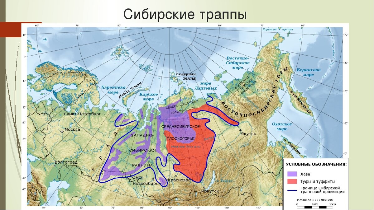 Сибирские траппы — одна из самых крупных трапповых провинций мира, расположена на Восточно-Сибирской платформе. Сибирские траппы изливались на границе палеозоя и мезозоя, а именно пермского и триасовых периодов. Одновременно с ними произошло крупнейшее (пермо-триасовое) вымирание видов в истории Земли. Они развиты на площади около 4 млн км2, объем извергнутых расплавов составил порядка 2 млн км3 эффузивных и интрузивных пород. Траппы развиты во всей Восточно-Сибирской платформе, в Хатангском прогибе, в Минусинской котловине, зона магматизма простирается и на шельфе Евразии, на дне Карского моря. В районе их развития расположены реки Нижняя Тунгуска, Подкаменная Тунгуска, Тюнг и др. Сибирские траппы слагают плато Путорана. Эта катастрофа произошла четверть миллиарда лет назад и длилась, по всей видимости, сотни тысяч лет. За всё это время на поверхность вылилось порядка 2 миллиардов кубометров расплавленной породы. Она покрыла почти