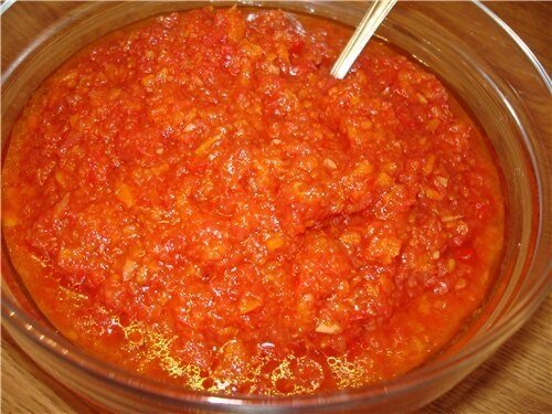 10. Красный стручковый перец - 4 штуки Инструкция приготовления 1. Помидоры, яблоки, морковь и сладкий перец помыть, очистить, пропустить через мясорубку и варить на медленном огне 1 час. 2. Добавить растительное масло, уксус, варить еще 1 час. Добавить сахар, соль, размолотый чеснок, горький перец и готовить еще 30 минут на медленном огне. 3. Разлить по банкам горячей. Закатать крышками.
