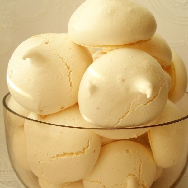 Ингредиенты: - 2 охлажденных яичных белка - 100 гр сахарной пудры - лимонный сок Приготовление: 1. Белки взбить с сахарной пудрой в густую массу, с добавлением нескольких капель лимонного сока. 2. Выпекать при 100 градусов 1 час в режиме конвекции и еще на 1 час оставить для остывания в духовке.