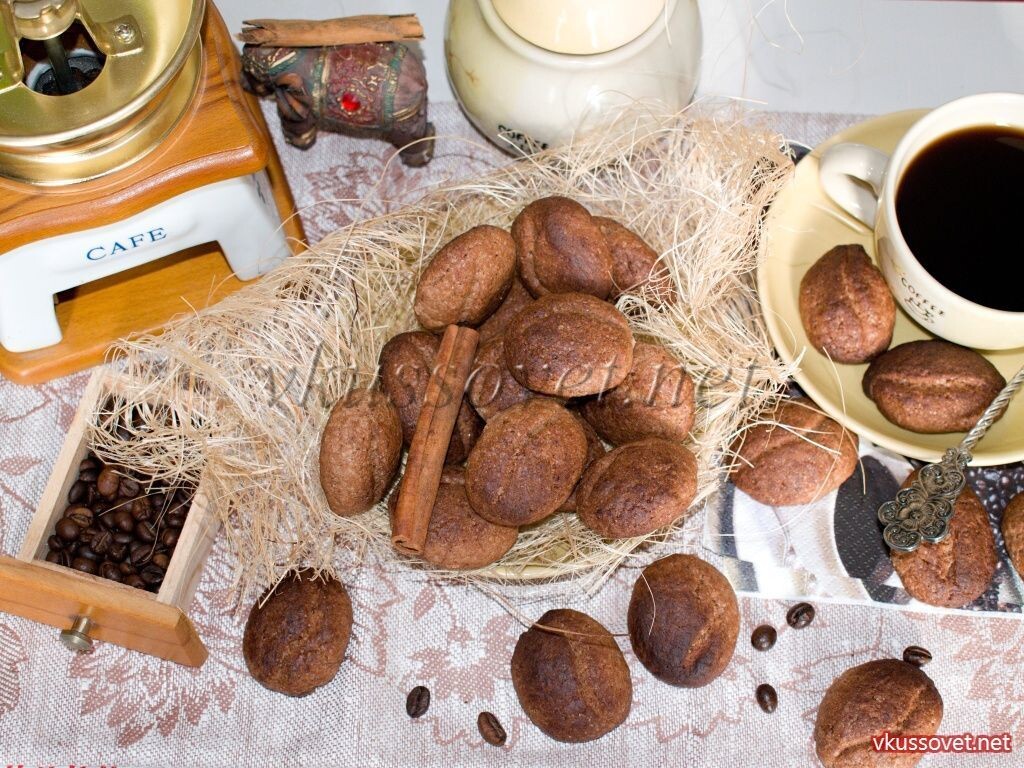 Кофейное печенье, напоминающее по внешнему виду зерна кофе, имеют аромат и вкус свежезаваренного кофе. Песочное печенье получается хрустящим и сытным, поэтому отлично подходит для завтрака. Подавать его можно с горячим какао, молоком или кофе со сливками. Необходимые ингредиенты: - 230 г. пшеничной муки; - 120 – 150 г. сахара; - 20 г. какао – порошка; - 130 г. сливочного масла (порезанного кубиком); - 20 мл. заваренного кофе в чашке; - 5 – 10 г. молотого кофе. Рецепт приготовления Печенья «Кофейные зерна» с пошаговыми фото Вы можете посмотреть на сайте.