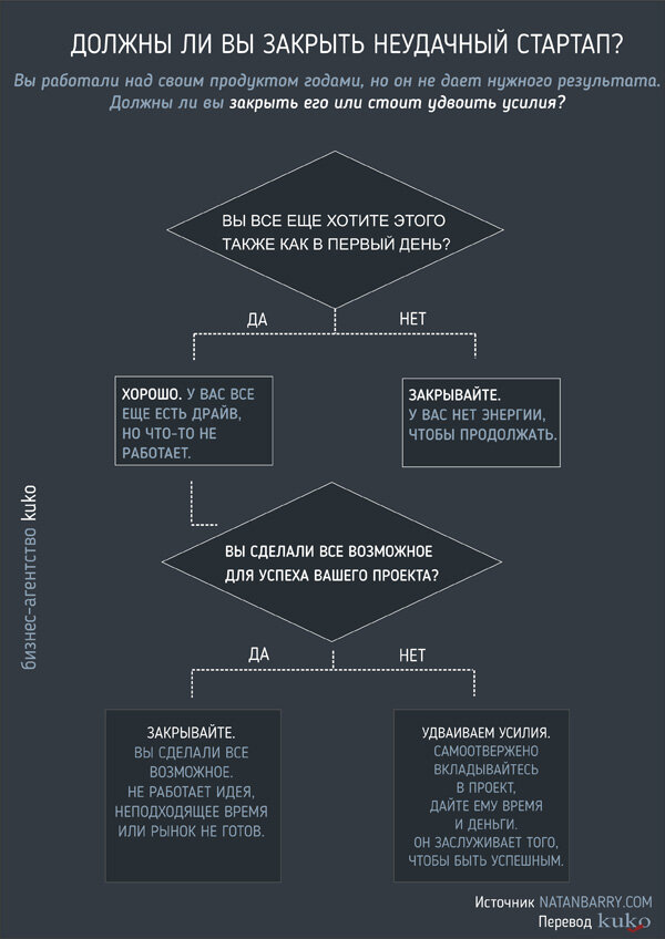 Если ваш ответ «Нет», и вы не обеспечили своему проекту все возможные шансы на успех и не приложили максимум усилий - тогда, возможно, пришло время увеличить ваши старания. Но если вы действительно вкладывали в проект всю свою энергию, внимание и сосредоточенность на протяжении нескольких последних лет, а бизнес все еще не работает – вероятно, пришло время закрывать свой стартап.