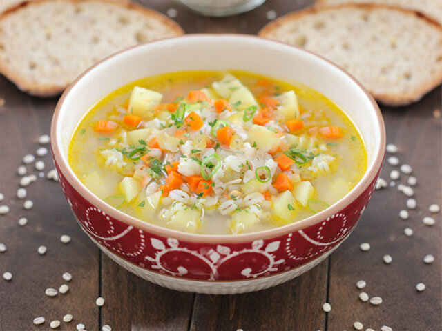 - Как только крупа будет готова, добавить рубленный зеленый лук, укроп и измельченную петрушку, приправить специями по вкусу, прокипятить бульон еще раз и разлить по тарелкам.
