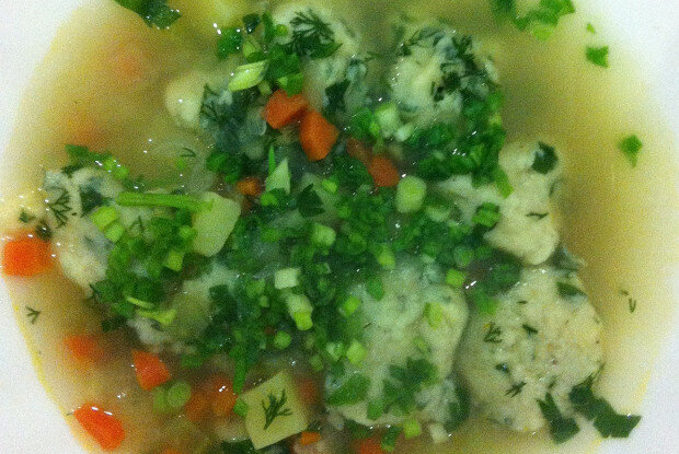 7. Разложить клецки и куски мяса по тарелкам, залить горячим супом, украсить рубленной петрушкой и зеленым луком.