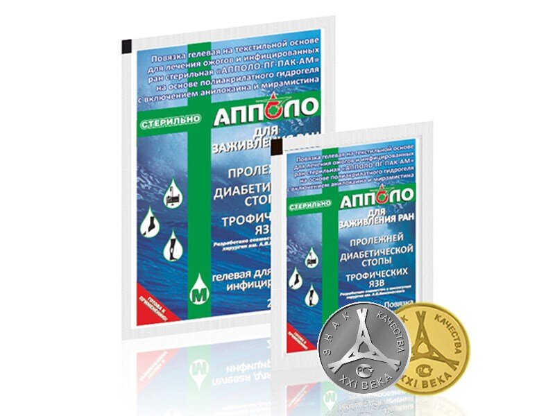 Предназначена для эффективного лечения ран, различного происхождения, в том числе при порезах, ссадинах, трофических язвах, диабетической стопе, пролежнях, долго не заживающих ран. Изготовлена из сетчатого материала с нанесенным на него гидрогелем с включением анилокаина (анестетика) и мирамистина (антисептика). Повязка легко моделируется на различных участках тела и безболезненно удаляется при перевязке. Повязка ранозаживляющая «АППОЛО» обладает следующими свойствами и преимуществами: - обезболивает через 2-3 минуты после нанесения не менее чем на 1,5 часа; - обеспечивает пролонгированный лечебный эффект; - обладает антимикробным действием; - предотвращает инфицирование ран; - ускоряет заживление ран; - благодаря структуре гидрогеля на коже не остается следов – рубцов, шрамов и т.п. Гелевая повязка ранозаживляющая разработана совместно с институтом хирургии им. А.В. Вишневского (Регистрационное удостоверение № ФСР 2010/09103) Повязки выпускаются в герметичной п/эт упаковке с насечко
