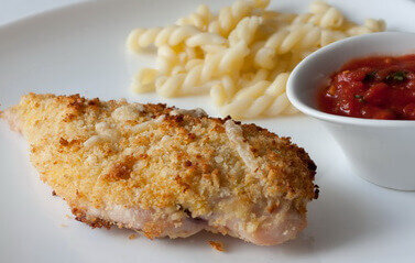 Все гениальное — просто! Преимущества этого блюда в том, что при приготовлении практически не используется жир, поскольку филе готовится в духовке на решетке. И именно поэтому может считаться диетическим. Такая облегченная курочка прекрасно подойдет на ужин. На гарнир — что угодно, но посоветую также томатный соус собственного приотовления. Хлеб и пармезан нужно измельчить в блендере, смешать с оливковым маслом и немного посолить. Это панировка для грудки. Но сначала нужно взбить яйцо и обмакнуть подсоленую и поперченую грудку сначала в муку, затем в яйцо и только потом в панировку, причем проделать это только с одной стороны грудки. Затем поставьте грудки в разогретую до 220 гр.С. духовку и запекайте 10-12 минут на решетке, подставив форму. Можно также просто выложить грудки в форму, жир при этом ложить не нужно. За 5 минут до готовности нужно посыпать грудки тертым сыром. Главное — не пересушить, поскольку сушеная куриная грудка не так вкусна!