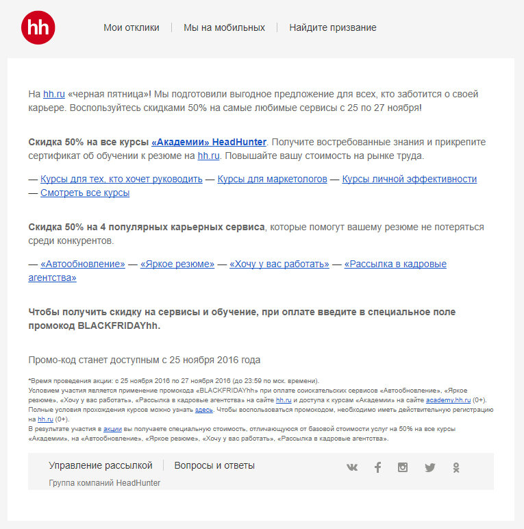Известный сервис по поиску вакансий HeadHunter не упустил возможности поучаствовать в «Черной пятнице». Скидка 50% на все курсы «Академии HeadHunter» порадовала тех, кто давно хотел получить доступ к этим видеоурокам. Такая же скидка на популярные услуги для повышения эффективности поиска работы стала удачей для тех, кто сидит на диване не первый месяц.