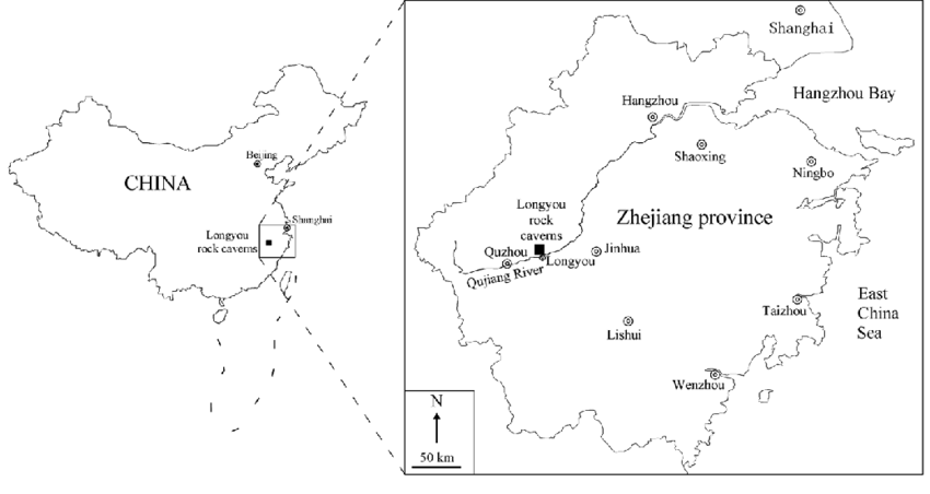 Горные пещеры Longyou представляют собой группу крупных скальных полостей на мелководных глубинах, чисто вырезанных в глинистом алевролите мелового возраста древними людьми около 2 000 лет назад. Они расположены на небольшом холмистом месте на северном берегу реки Цюцзян в округе Лонгью в центре бассейна Цюйчжоу-Цзиньхуа, провинции Чжэцзян, Восточный Китай (рис.1 и 2).