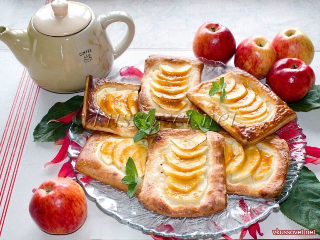 Пока на дворе яблочная пора приготовьте легкую выпечку с домашними яблочками. Для выпекания яблочных слоек желательно взять твердые и кислые яблоки. Слоеное тесто можно не готовить, а приобрести заранее в замороженном виде. Так же вам понадобится любой сладкий джем – абрикосовый, персиковый, сливовый или яблочный. Слоечки получаются сладкими, вкусными и ароматными – великолепный завтрак. Необходимые ингредиенты: - 1 пачка дрожжевого слоеного теста (2 листа) + 2 ст. ложки муки; - 500 – 600 г. яблок (твердых); - 2 ст. ложки джема + 1 ст. ложка воды; - 1 желток + 2 ст. ложки воды. Как приготовить слойки с яблоками Вы можете посмотреть на сайте.