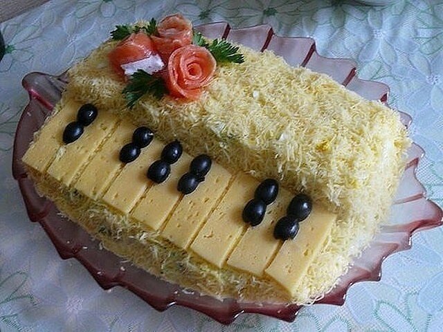 Продукты. Куриное мясо - 500 гр., огурцы - 2 шт., яйца - 3 - 4 шт., Ваши любимые грибы - 300 гр., твёрдый сыр - 100 гр., майонез. Рецепт приготовления праздничного салата "Белый рояль": Готовится салат очень просто и быстро. Весь процесс приготовления салата состоит из слоев, которые выкладываются в определенной последовательности. Теперь нужно подготовить продукты к укладке: - куриное мясо следует отварить, - грибы обжарить на сковороде, - огурцы натереть на крупной тёрке, - яйца также отварить и натереть на крупной тёрке. Теперь, когда все ингредиенты подготовлены должным образом, приступим к формированию салата. Слои выкладываем в определенной последовательности: - курица отварная, - майонез, - грибы жаренные, - майонез, - свежие огурцы, - майонез, - вареные яйца, - майонез, - сыр. Салат почти готов, нам осталось его только украсить в виде рояля, используя для этого твердый сыр и оливки черного цвета. Также Вы можете при помощи помидора сформировать красивую розочку,