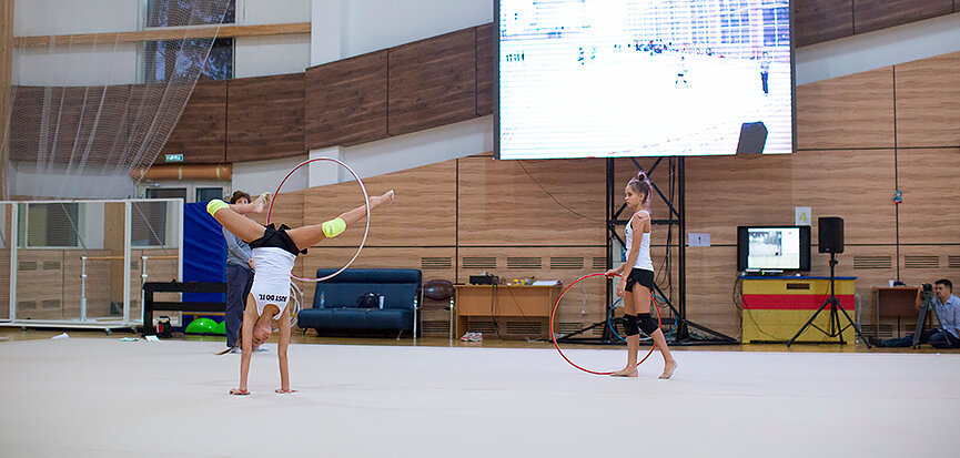 И действительно, сразу все получалось. Просто сеанс группового гипноза! В какой-то момент нам показалось, что мы в Хогвардсе: магическим образом обручи взмывали в небо, выписывая в воздухе пируэты, и, танцуя, возвращались к девушкам, успевшим за это время проделать сложные трюки. Но тут случилась заминка – не получался трудный элемент. И гимнастки раз 30, не меньше, его повторили, пытаясь вместе с тренером понять, как лучше выполнить тяжелейшую фигуру. Они вглядывались в огромный экран с видеозаписью, экспериментировали, опять смотрели на экран, анализировали, повторяли снова и снова. В конце концов все получилось. Цена чуда, которое мы обычно наблюдаем с телеэкранов, стала понятна. Шел шестой час тренировки…