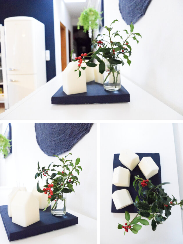 Сегодня я хочу рассказать о небольшом проекте рождественского подсвечника для четырех свечей, который я сделала своими руками в начале декабря. мы с мужем уже который год отказываемся от рождественской ёлки в пользу минималистичных украшений и свежей хвои. Так было уже в последние два года . Честно признаться, совершенно не хочется наряжать ёлку в период, когда на улице плюс 15. Рождественские свечки мы всё же решили сохранить (по немецкой традиции зажигать по одной из них в каждую новую субботу декабря). Теперь смотрим на детали такого простого подсвечника… для подсвечника мне понадобились: шаг 1. используем крышку от коробки в качестве формы для бетонирования гипсом. шаг 2. в еще слегка мягкую массу гипса вставляем свечи и даем всей конструкции застыть. шаг 3. очищаем получившуюся подставку со свечами от формы. шаг 4. красим основание подсвечника в понравившийся цвет шаг 5. ожидаем, когда краска засохнет и снова выставляем все свечи в углубления формы, а также добавляем
