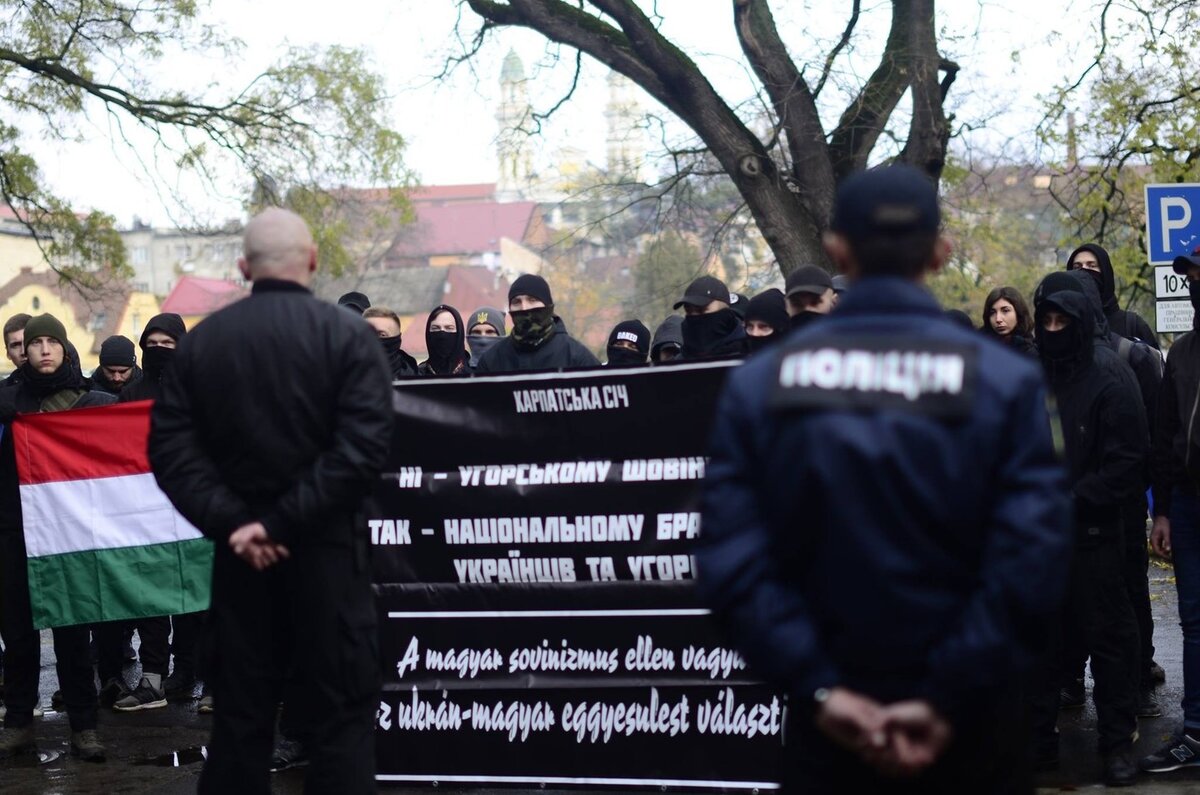 11 ноября аналогичная акция под лозунгом "Нет венгерскому шовинизму" прошла под стенами консульства Венгрии в Ужгороде, центре Закарпатской области. Заблокировали вход в консульство представители ещё одной "Карпатской Сечи" — одноимённой, но не тождественной свободовской структуре националистической организации, которая существует в Ужгороде с 2010 года. Зимой 2013–2014 годов эта "Карпатская Сечь" входила в состав "Правого сектора", далее её участники воевали с лета 2014-го в АТО в рядах Добровольческого украинского корпуса "Правый сектор", создав там спецподразделение "Карпатская Сечь". В 2015-м эта часть легализовалась как рота спецназа в батальоне Национальной гвардии "Донбасс", а командир роты Тарас Деяк, вернувшись в Ужгород, возглавил там Гражданский корпус "Азов-Закарпатье".