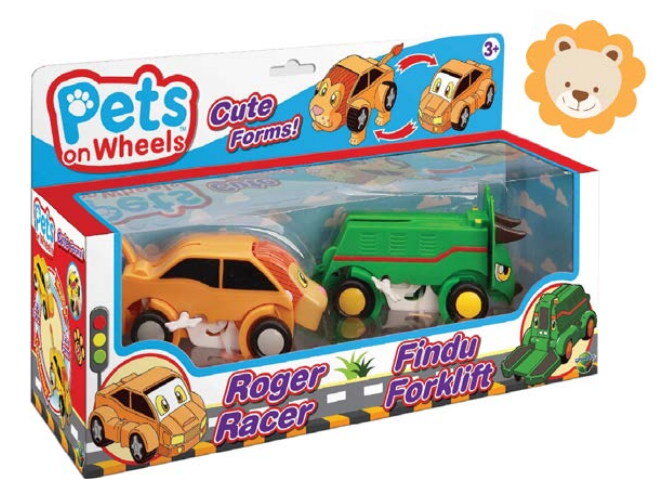 Сезонная новинка осени 2017 года от компании Dracco – линейка машинок-трансформеров Pets on Wheels, которые умеют превращаться в милых животных: собачек, панду, льва, динозавра и т. д. Такие машинки понравятся не только мальчикам, но и девочкам! Питомцы на колёсах! Механика игры простая и завораживающая одновременно: сбоку игрушки располагается ключ завода, который даёт импульс для движения и трансформации персонажа. У каждой игрушки есть собственное имя, такая персонализация создаёт эмоциональную привязанность малыша к своему игрушечному другу. В ассортименте как отдельные машинки в упаковке, так и наборы по две игрушки в одной коробке. Яркая и необычная новинка для всех любителей машинок и игрушечных животных! Ваше сафари с такими игрушками может приобрести совершенно новый смысл! Пример трансформации: Игровые наборы серии: