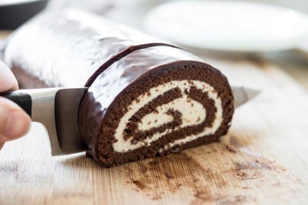 Массу из печенья раскатать на пищевой пленке в прямоугольник (не слишком толстый), сверху распределить кокосовую массу, свернуть рулетом и убрать в морозилку на час. Застывший рулет порезать острым ножом.